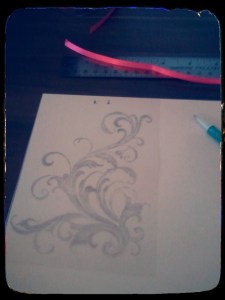 Invites: Silver cardstock with a vellum overlay, held together by a fuchsia ribbon. I must admit, they’re quite fetching and were dropped in the mail last Friday afternoon. Here’s a sneak peek at the invite – and that’s a rubber stamp design, not my own doing.