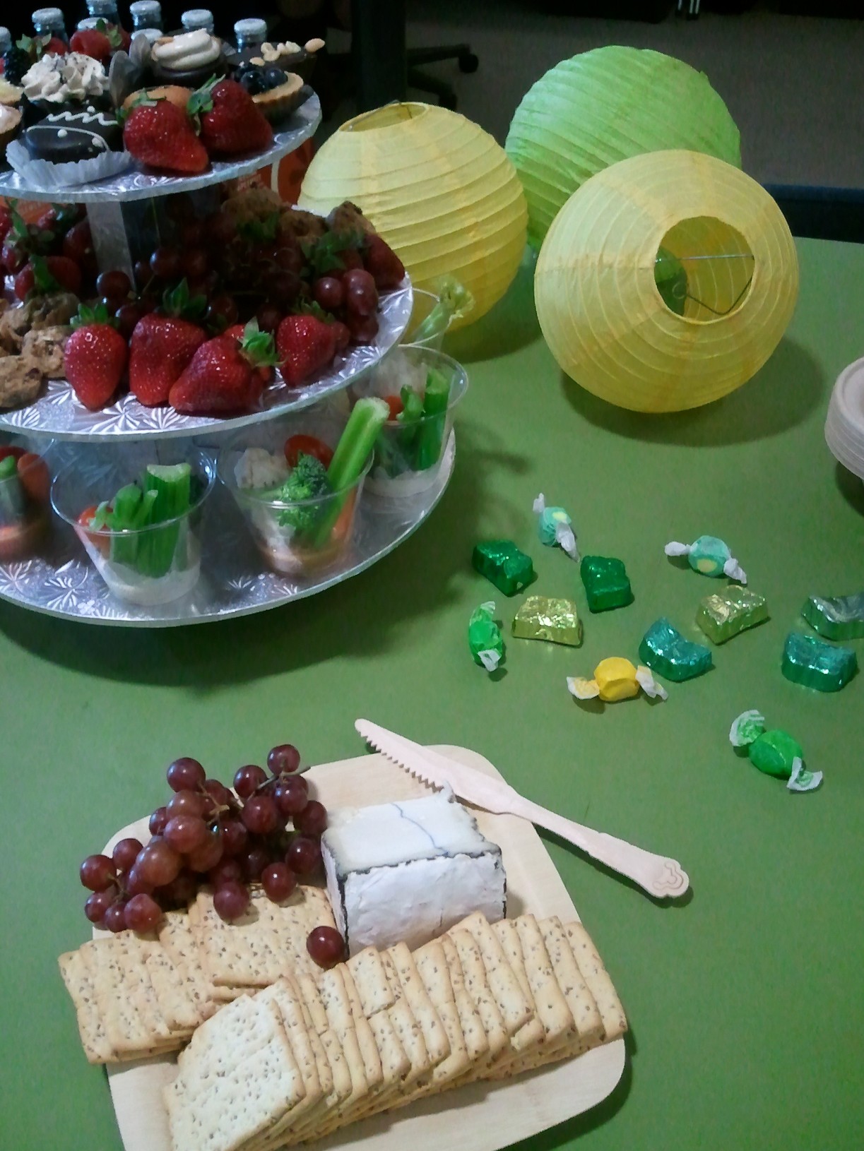 For decor, I used green butcher paper to cover a portion of the conference table, small