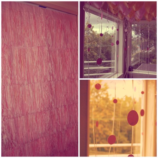 The couple lives in a beautiful top-floor condo overlooking Lake Union. I wanted to make sure the guests could enjoy the view and have fun yet elegant decor, keeping in mind what the event was really about: breast cancer awareness. Thanks to 80 pink and gold balloons and a pink fringe covered door, “elegant fun” was accomplished. To add a little shimmer to the party, I added small and large pink sparkling pink dots to the white ribbons hanging from the balloons. To keep it from being overwhelming, about half of the ribbons were “dotted.” Throughout the silent auction and food areas I placed small potted pink spray roses, wrapped in fuchsia tissue and tied with gold ribbon.
