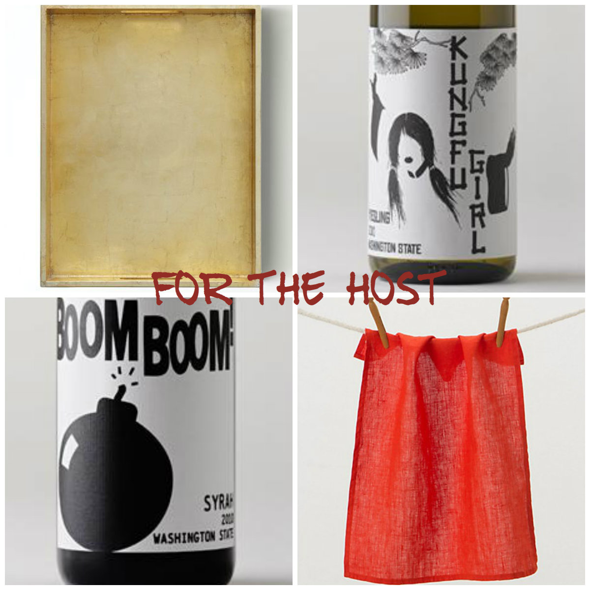 Gold Lacquer Tray, West Elm / “Kung Fu Girl” Riesling & “Boom Boom!” Syrah, Charles Smith Wines, ask your grocery store’s wine steward / Linen Dishtowel, Anthropologie