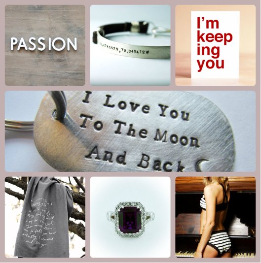 Passion Push Pins (similar ones here) / Leather Cuff / Card / Key Chain / Mr. Darcy Proposal Scarf / Diamond & Amethyst Ring / Lingerie