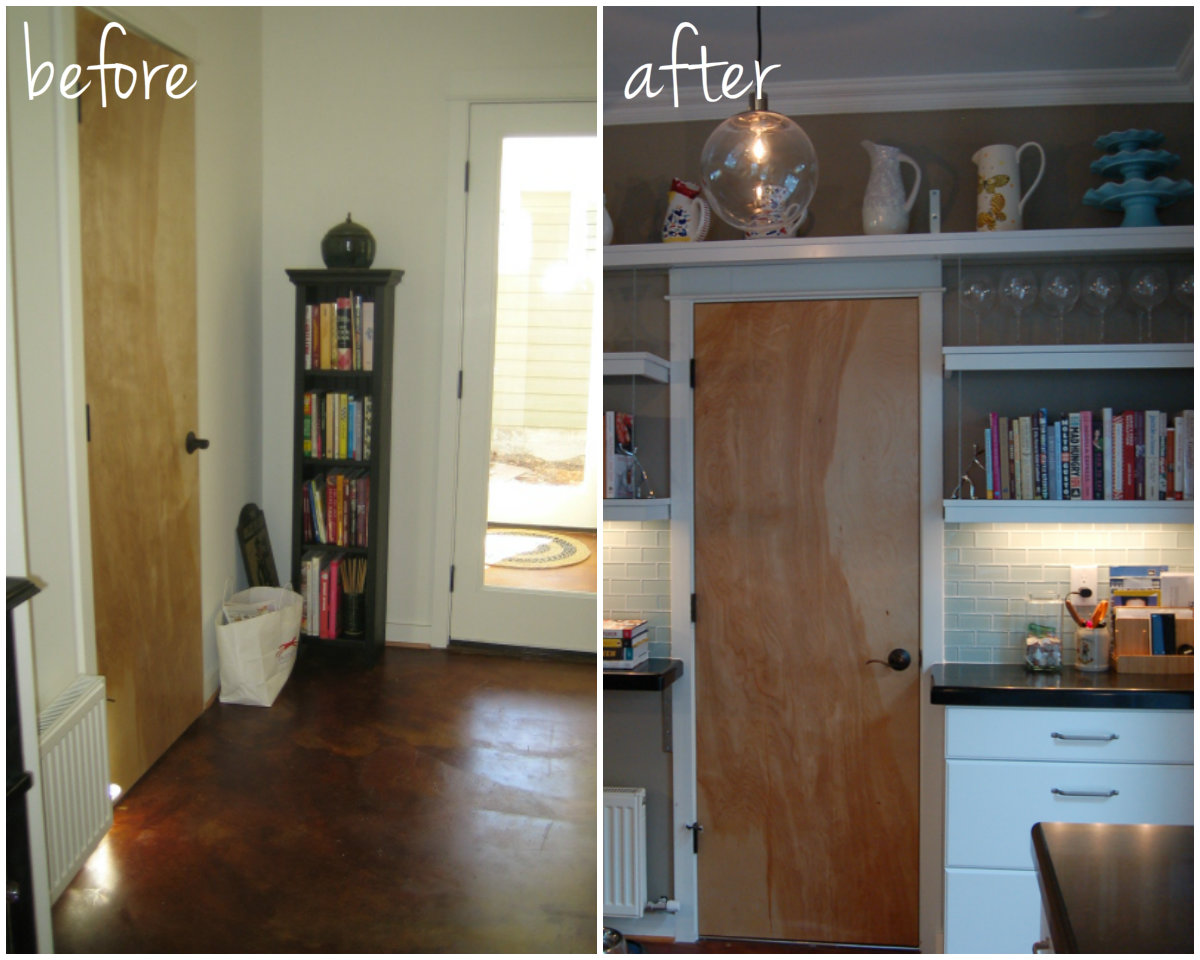 During our consult, we wanted a few things specifically within the kitchen area: a place for my cookbooks, a magnet board similar to one I saw on another blog for both the kids and our own message area (but framed), and we knew there was just a lot of opportunity for better use of space. He saw our “home command center” took up valuable real estate on the sink-side counter and suggested creating its own space along with shelving on the bathroom wall side (yeah, that door isn’t for the pantry, but for a little powder room – slightly awkward placement but it works). We also explained we were light on light: one little fixture that had bulbs constantly burning out and if you were standing at the counter, you were blocking the light. So, thankfully, Sam fixed that with some incredible ceiling and under-cabinet lighting that I have started referring to as “sassy lights” since everything is on a dimmer or has a high/low setting. Serious kitchen mood lighting here folks.
