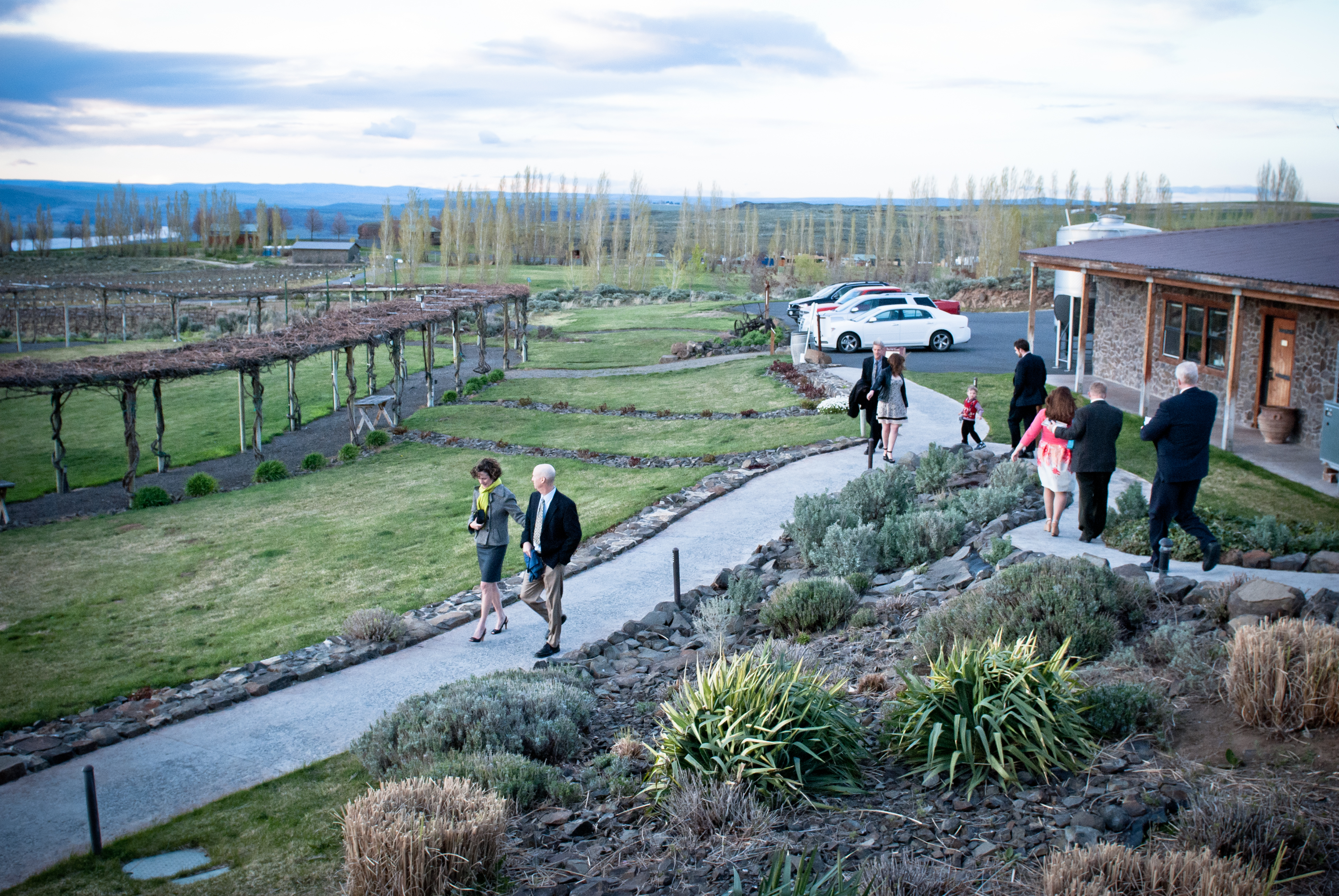 Guests arrived Friday afternoon and enjoyed a delicious dinner highlighting Cave B’s beliefs of farm to table cooking. On Saturday, guests enjoyed wine tasting events, the spa and were able to explore the grounds. In the early evening, before the ceremony, guests enjoyed Cave B’s wines, appetizers and an amazing view of the vineyards and Gorge from the Estate Room. The ceremony was officiated by Mark’s sister, Gay, and included handfasting and ribbon rituals. As a surprise for the couple, Gay had asked Mark and J.’s siblings to read the handfasting’s traditional poem. The ribbon used for the ceremony was passed to and held by their 38 guests, joining them together. After the ceremony, the guests enjoyed the reception dinner in the Winery’s Cave, which showcased the flavors of PNW. For dessert, 40 individual wedding cakes were served.