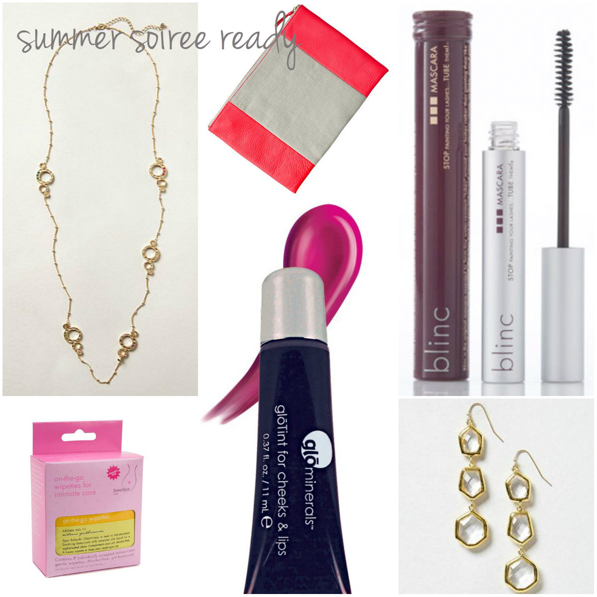 Prize includes: a long-strand necklace from anthropologie (layer it or wear solo), two-tone leather and canvas clutch from the gap (perfect for date night or a bridal shower), blinc mascara (no more raccoon eyes due to the summer heat and sweat), drop earrings from anthropologie (dress up a tank top or pair with a LBD), glo minerals check & lip tint (it might look dark but it’s a great color on everyone!), and sweet spot wipes (freshen up after a night of dancing or if you’re running late to a dinner date after a workout). Wowzers!