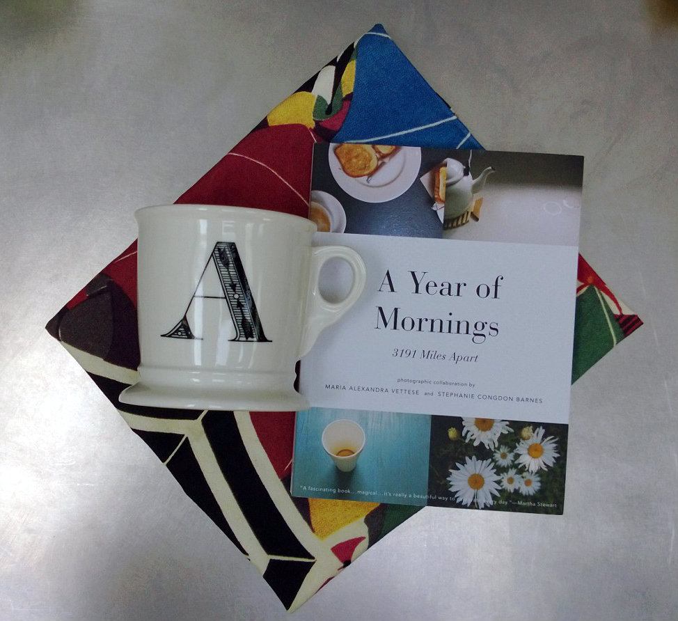 It’s the perfect book to keep near-by for those rare quiet moments you may find during the day, which means it’s the perfect gift book. I skipped the wrapping paper and used a tea towel as “wrapping” and included an initial mug for her morning coffee. We may not sit at the same table in the mornings, but this will have to do until we’re able to do so.