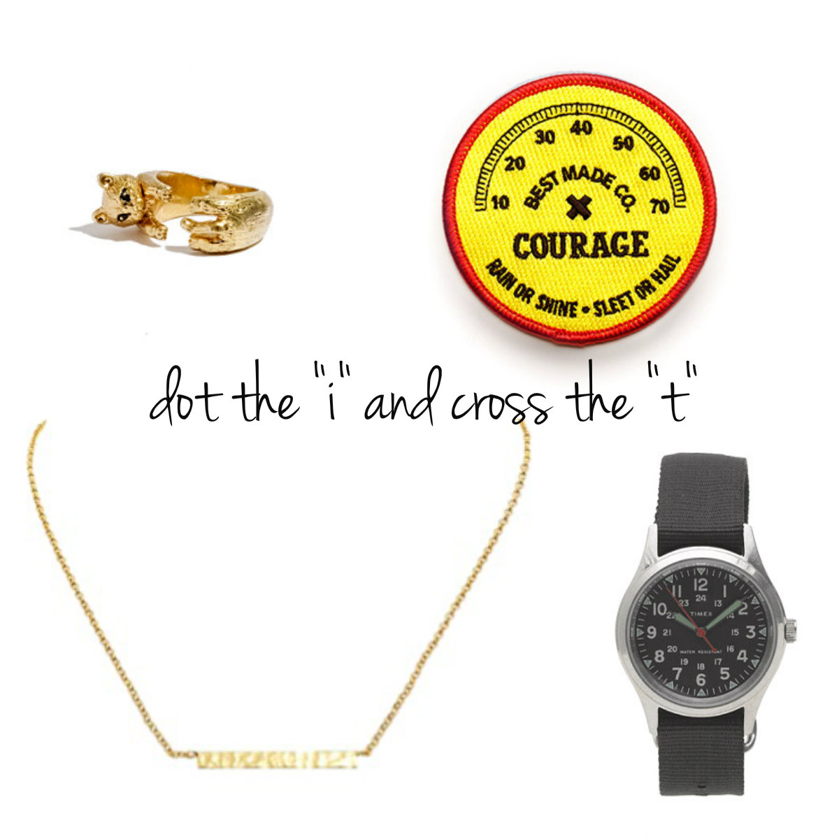 Little details to boost courage and celebrate milestones. A badge can serve as a reminder to be brave throughout the day (allow ’em to keep it in a pocket if it’s easier). A special watch for his first day of high school. A unique statement piece for her senior year. Clockwise from top left: cat ring / badge / watch / necklace