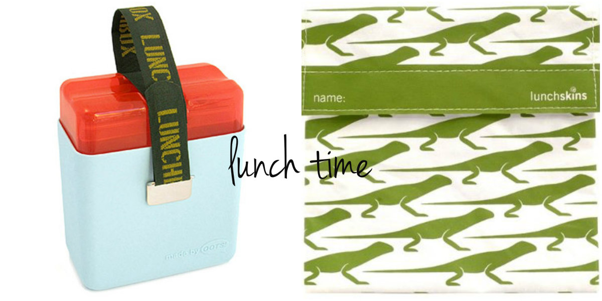 Have your kiddo rise above the sea of canvas and nylon bags with a cool box. From the left: lunchbox / reusable sandwich and snack bag set
