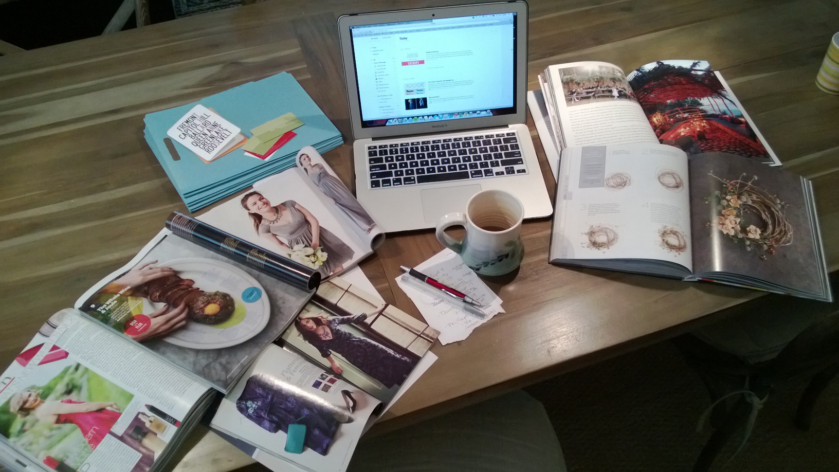 - left side of computer: Vogue, September 2013/Bon Appétit, September 2013/J.Crew Style Guide, September 2013/Boden, Autumn 2013/client folders, business cards to follow up on, a thank you card that needs to be written