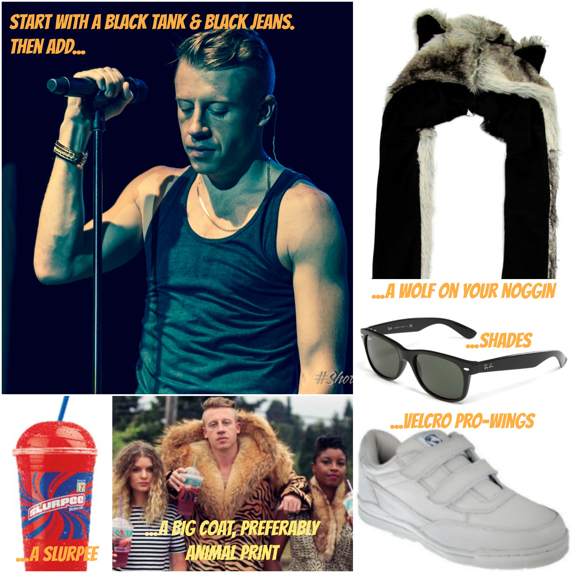 Extra points if you’re able to find a faux-fur coat and velcro Pro-Wings. And while I’m not always a big fan of costume props (it’s extra stuff to keep track of) the Slurpee adds a nice touch. Clockwise from top left: macklemore image via / wolf cap / shades / pro-wings / coat image via / slurpee