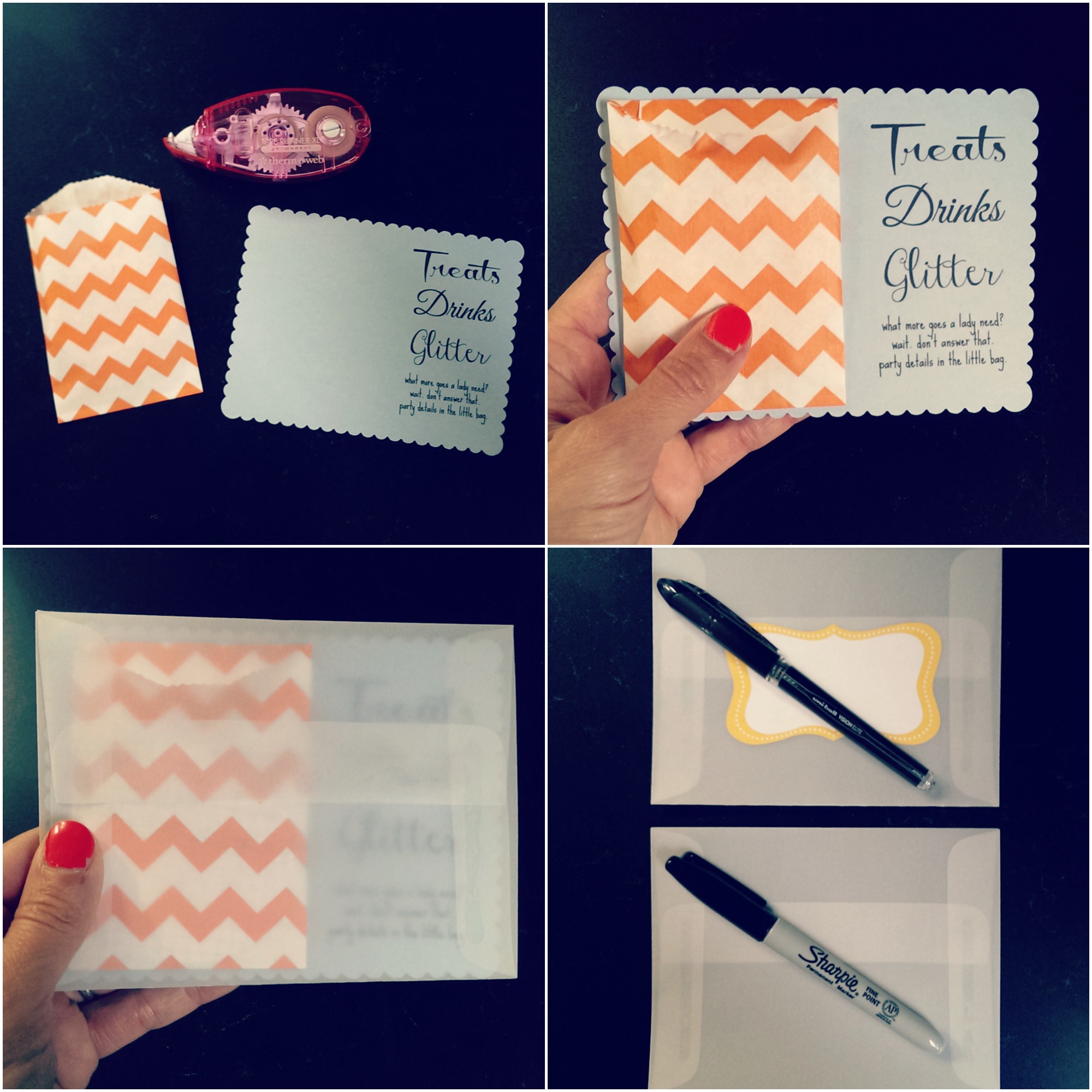 I used my printer for the cards’ text. It was really quick, but you could easily handwrite a line or two telling the invitee to look in the bag.