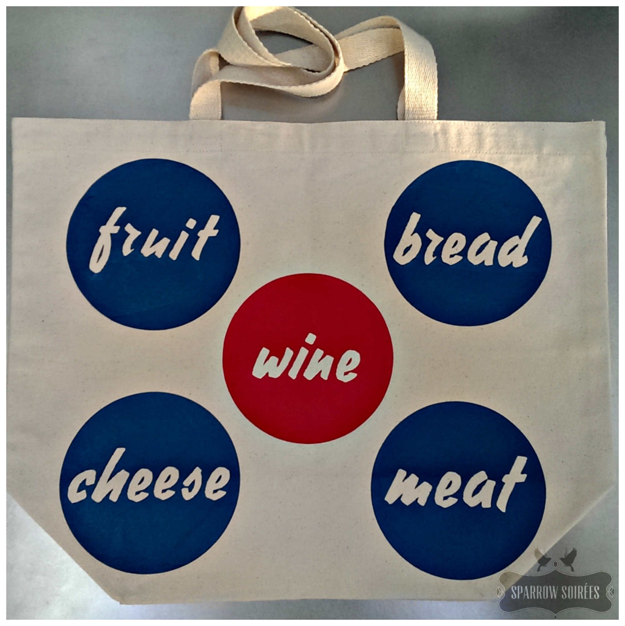 Design: I wanted something simple yet polished. The “to market” circle felt like it hit the mark. For the second design, I wanted something fun but tied in. The five circles – cheese, bread, meat, fruit, and wine – are always perfect for a chic party spread and items you could grab at a market. (Just FYI: I’m not an Illustrator or Photoshop whiz. I created both designs in Cricut Design Space.)