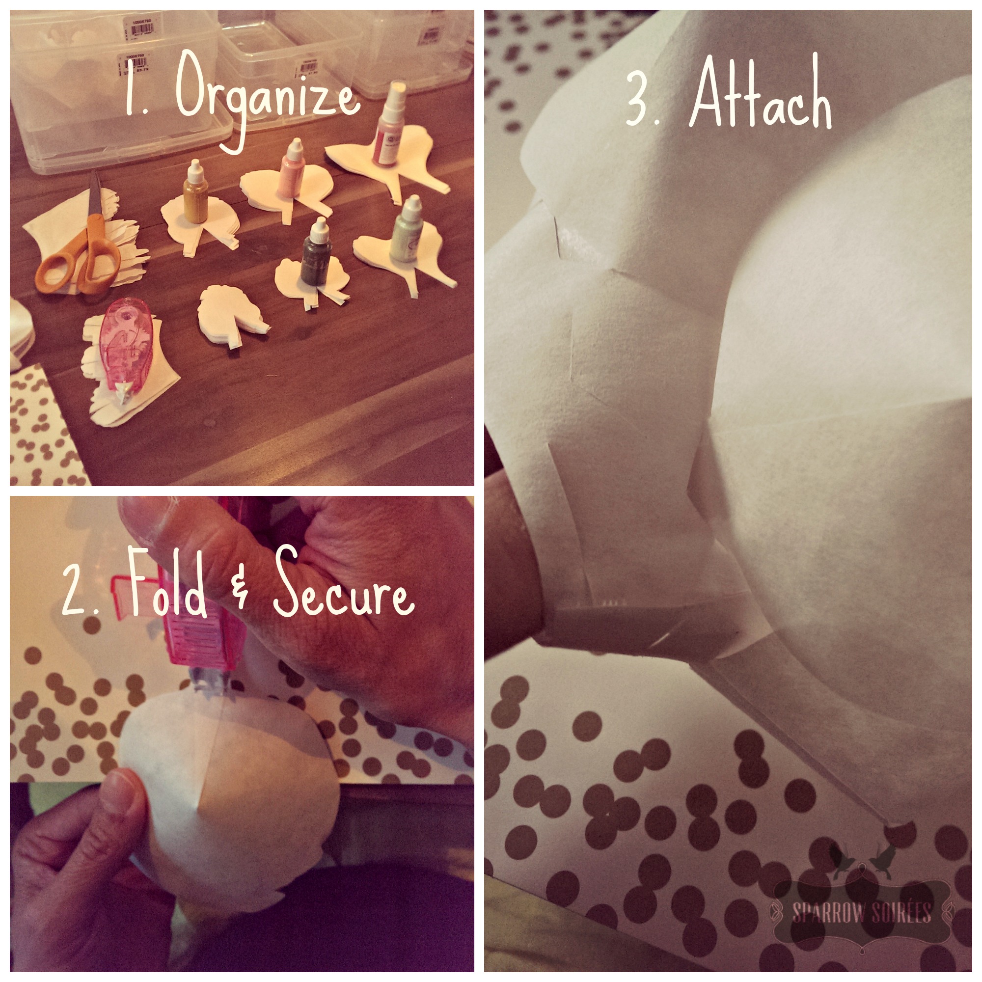 2. Follow the assembly directions in Cricut’s Giant Flower Book PDF. I found it was easiest to fold and secure the lower tabs using a tape roller, and then rolled a small piece of tape along the tab’s backside to help it stick to the “crown” (this will make complete sense when you make them). Just FYI: I used the tape roller instead of glue because a) it’s less messy, and b) prevents possible glue marks showing once the ink mixture dries.