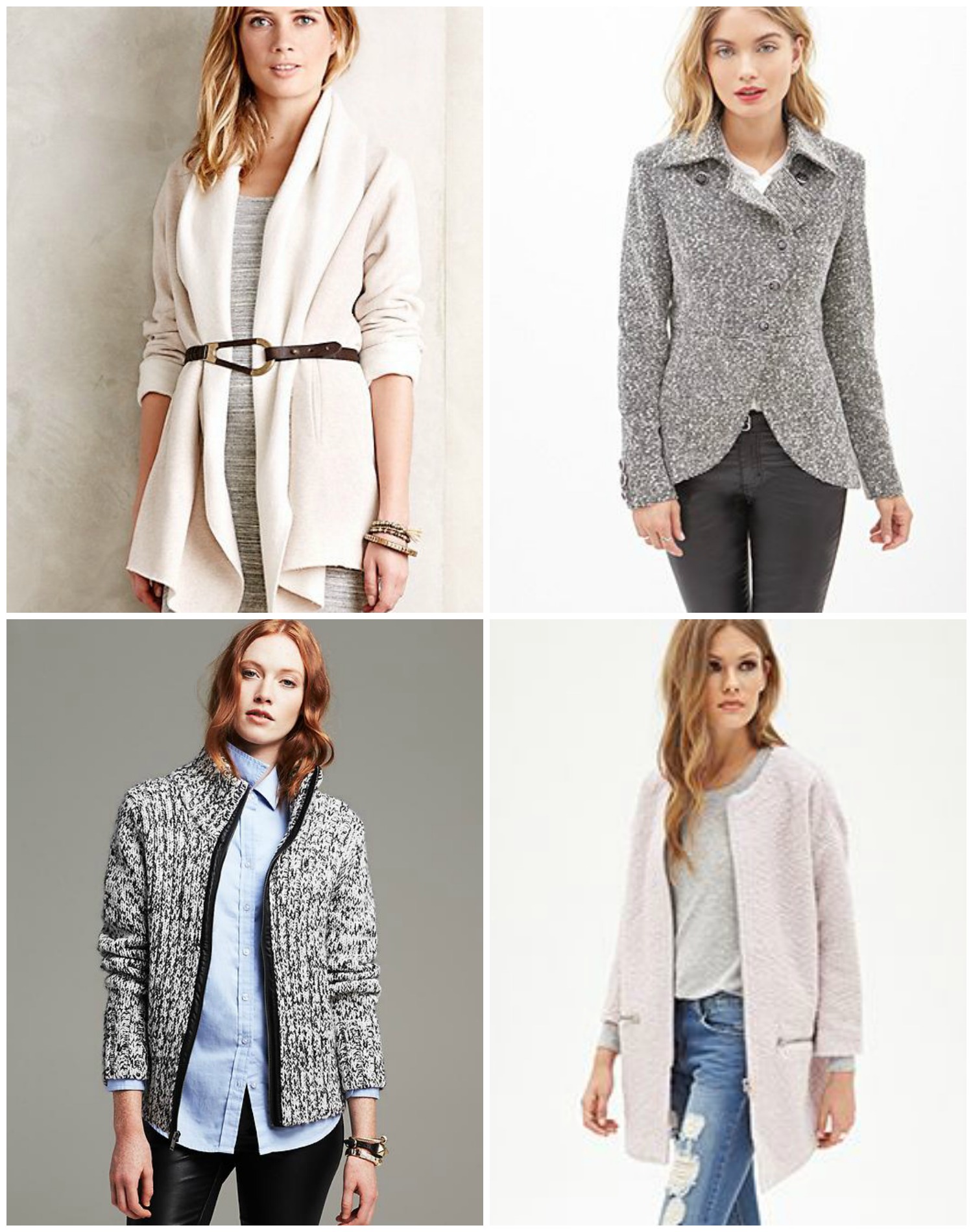 Clockwise from top left: Fleece Wrap Jacket // Tweed Cutaway Coat // Collarless Bouclé Coat // Marled Faux-Leather Trim Sweater Jacket
