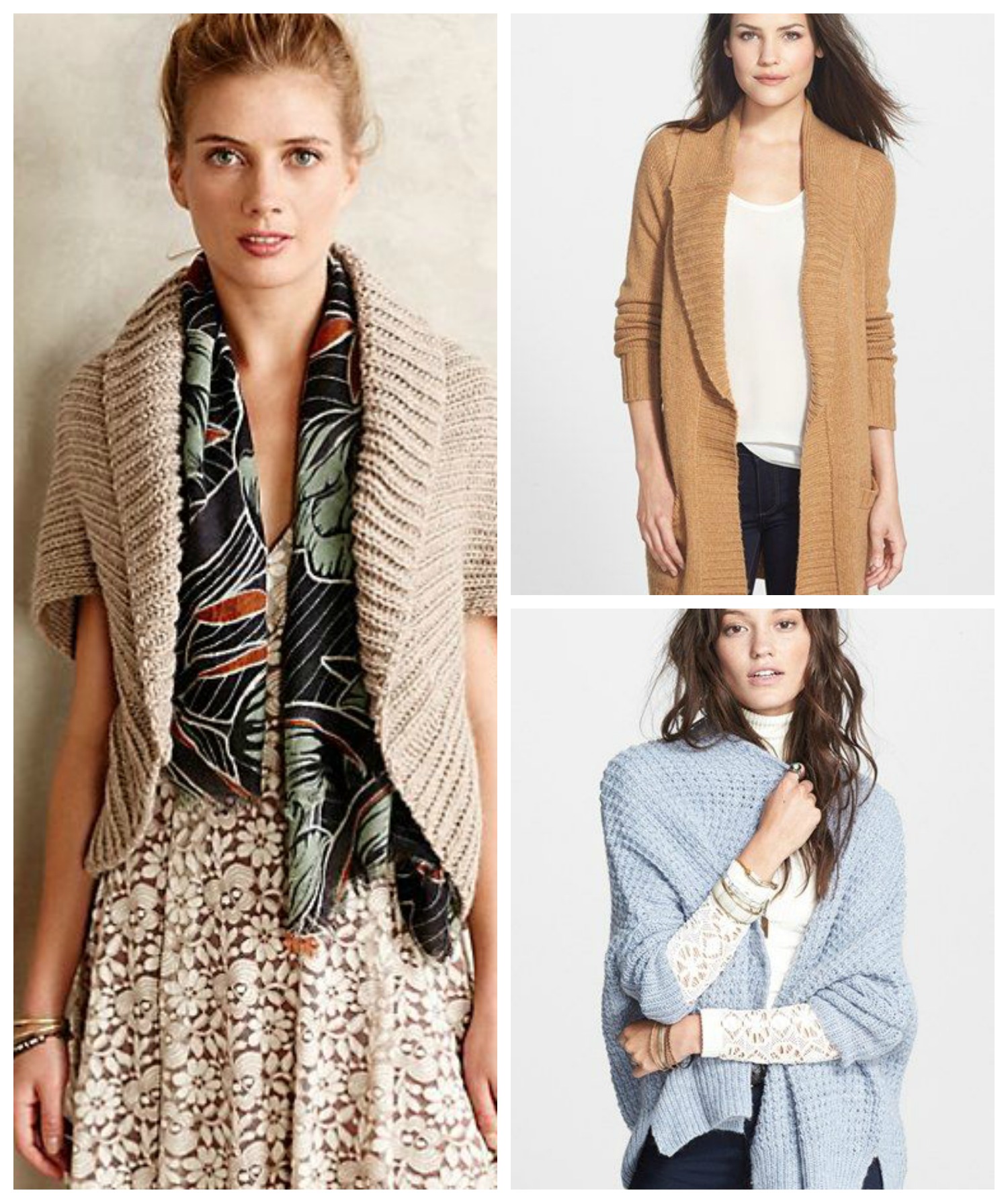 Clockwise from left: Camelback Cocoon Shrug // Shawl Collar Cardigan // Breeze Cardigan (similar)