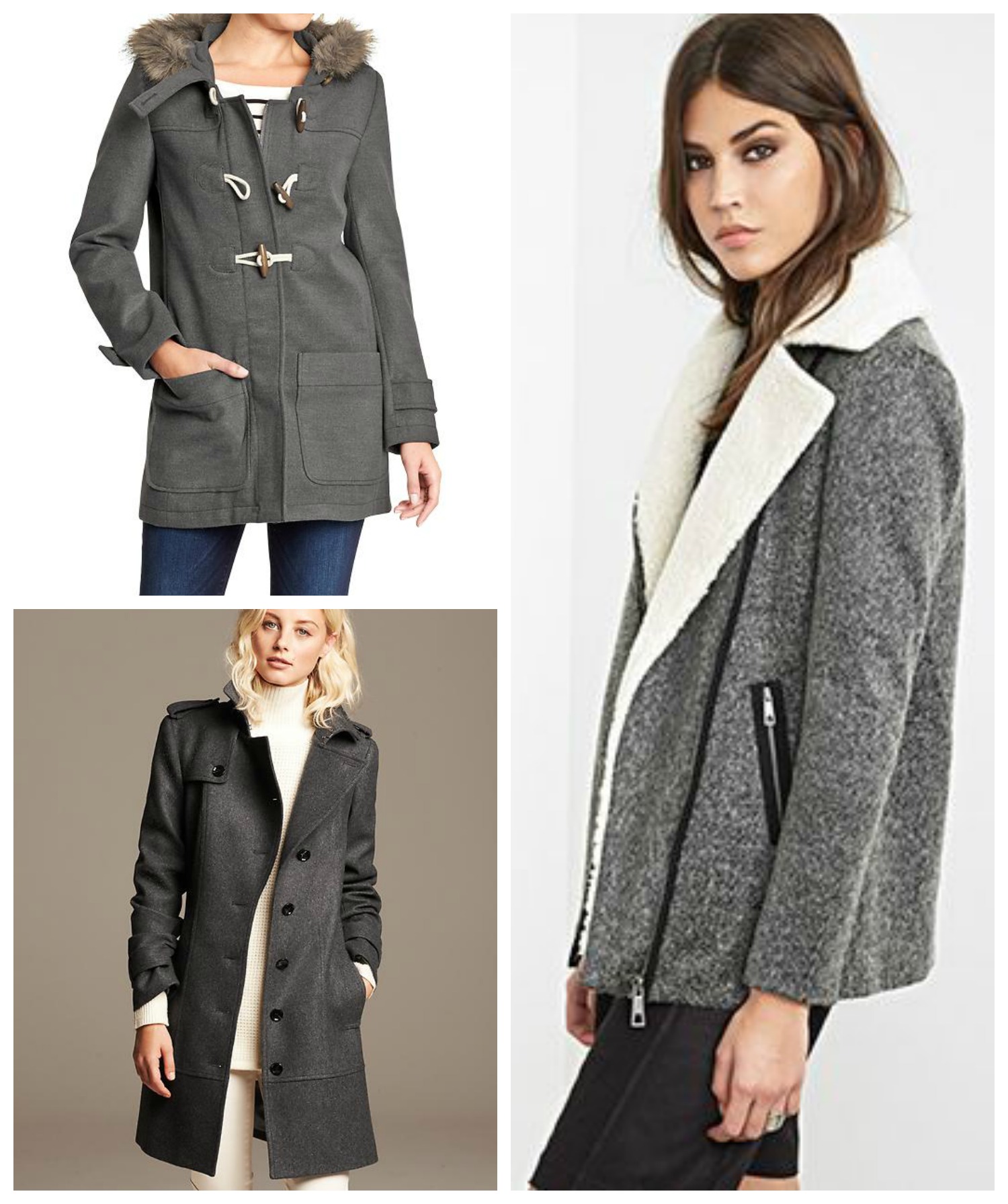 Clockwise from top left: Hooded Toggle Coat // Faux Shearling Collar Marled Jacket // Wool Trench