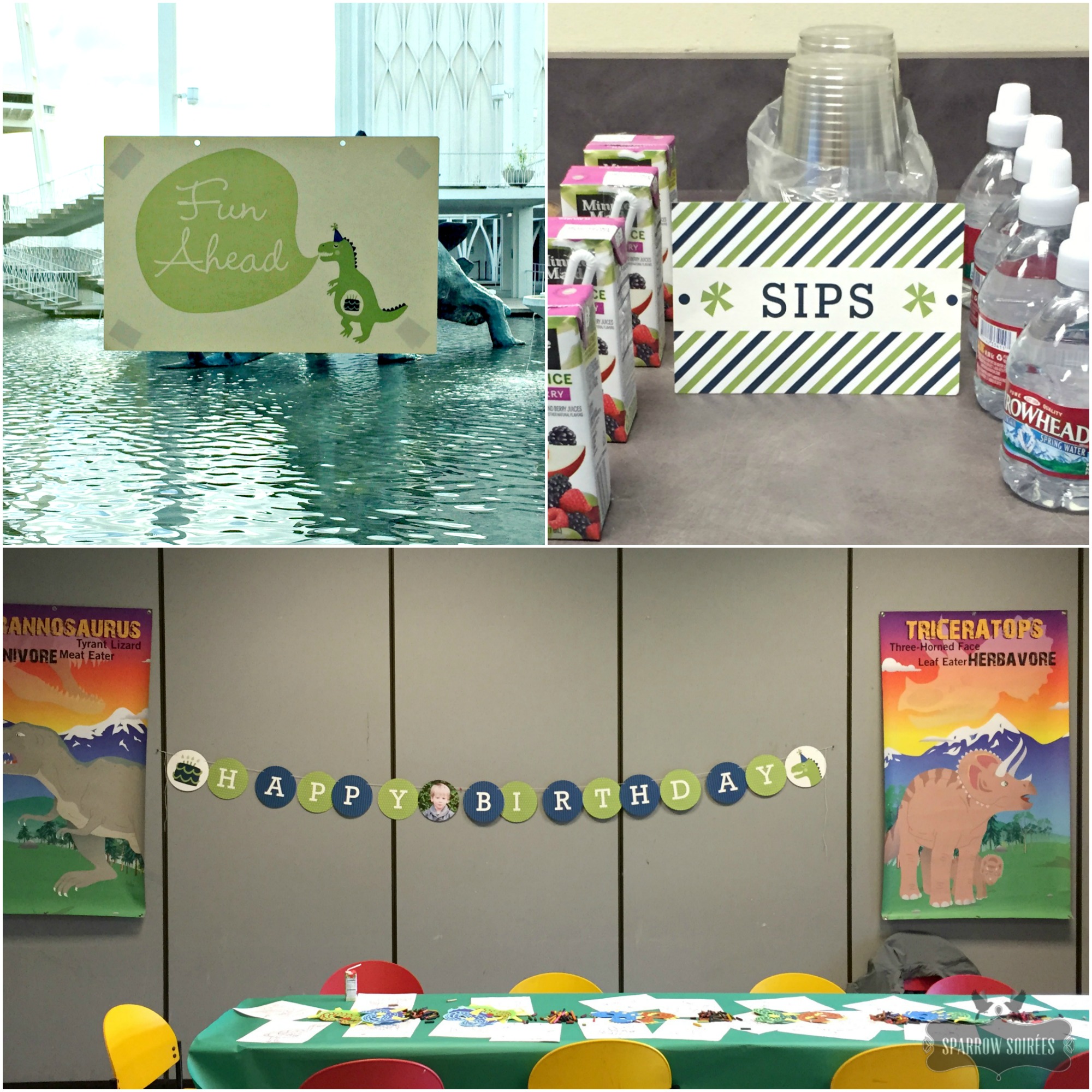 The Science Center was fantastic party venue. The only tricky part was we had 15 minutes to set up before the start time – so we quickly hung the banner and a directional sign, and sorted out the drinks for our little guests – all while making sure our boys didn’t run into a another room’s party. One of the main rules in event planning is to keep things simple as simple as possible when you’re tight on set-up time – and use every ounce of help a venue offers. Instead of attempting to haul in food, I used the on-site catering service for a few light snacks and the cake.